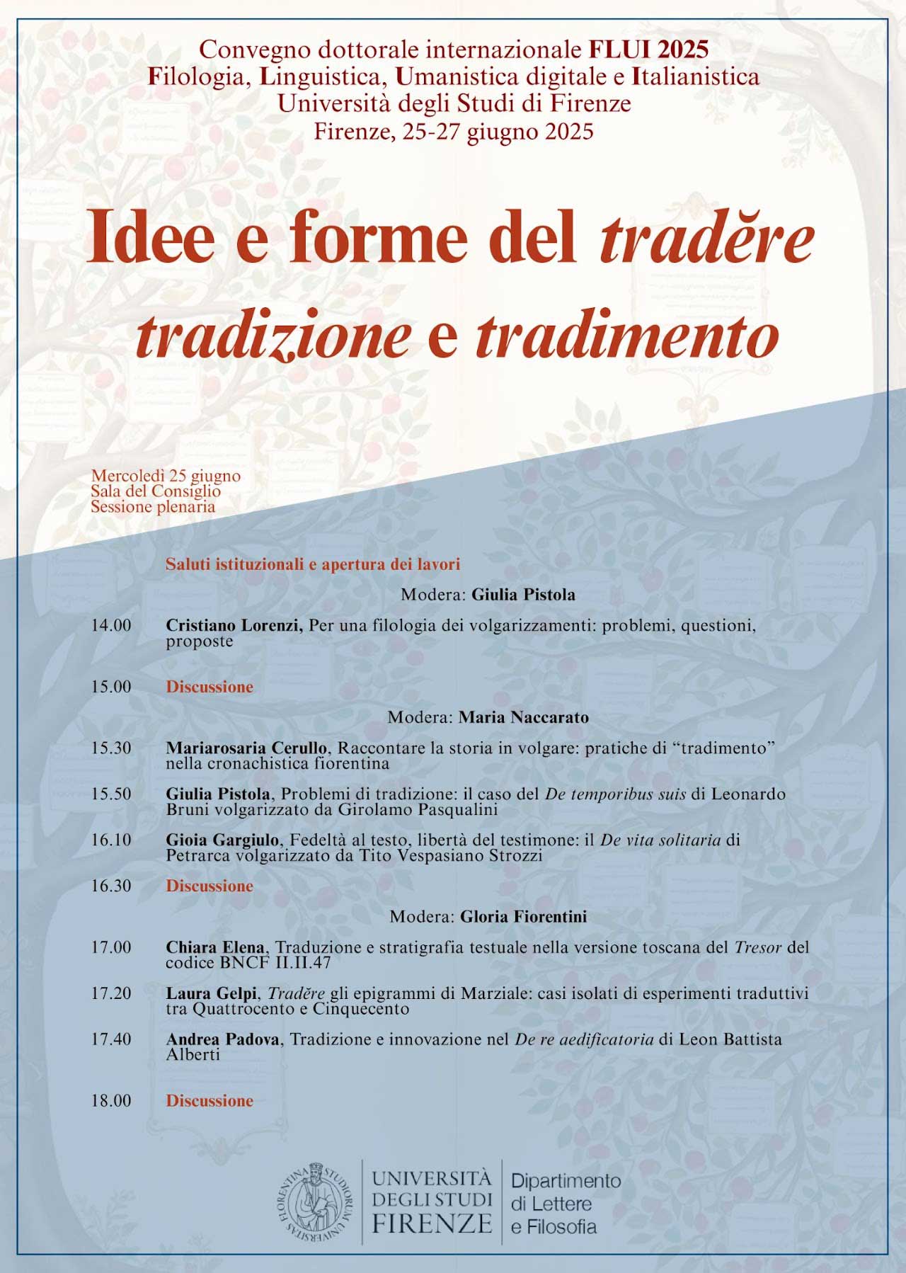 Ph.D. candidates from the XXXVIII and XXXIX cycles of the PhD program in Philology, Italian Literature, and Linguistics at the University of Florence announce the opening of the Call for Papers for the FLUI 2025 Doctoral Conference. The conference is open to doctoral students, early-career researchers, and those who have earned a master’s degree in the past three years or a PhD in the past five years. The conference theme focuses on the semantic developments of the Latin verb tradĕre, originally meaning “to hand over, entrust, or transmit” a task, object, or payment. Over time, tradĕre came to signify the passage of memories, information, and testimonies through time. More broadly the noun tradizione represents the transmission of systems of knowledge, beliefs, values, customs, and practices. In Latin, tradĕre also developed the specific meaning of “to hand over/submit to the enemy,” leading to the semantic outcome of betrayal, which signifies the failure to uphold a commitment or duty. Participants are invited to explore the diverse uses of this semantic spectrum, developing their contributions from philological, literary, linguistic, and/or digital humanities perspectives. Below are some suggested areas of inquiry.